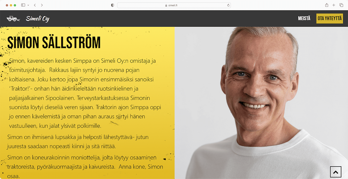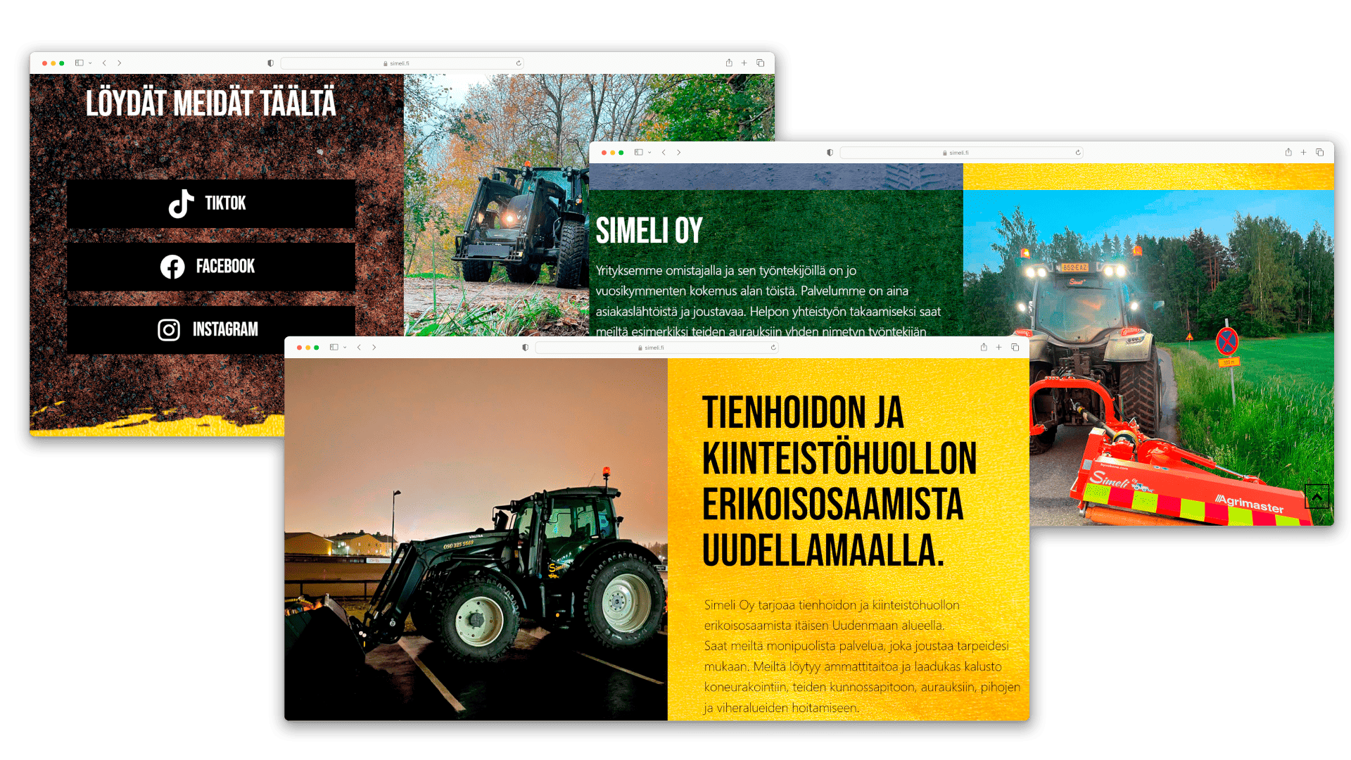 Simeli Oy serves the Eastern Uusimaa region and its services include various road and property maintenance work, transportation, and rental services. The purpose of the website is to increase bookings of their services, so that the customer would easy get in reach. Also the website is a great hub for all the company's social media platforms. The client wanted to incorporate elements they were already using in their brand's designs - the golden strip.